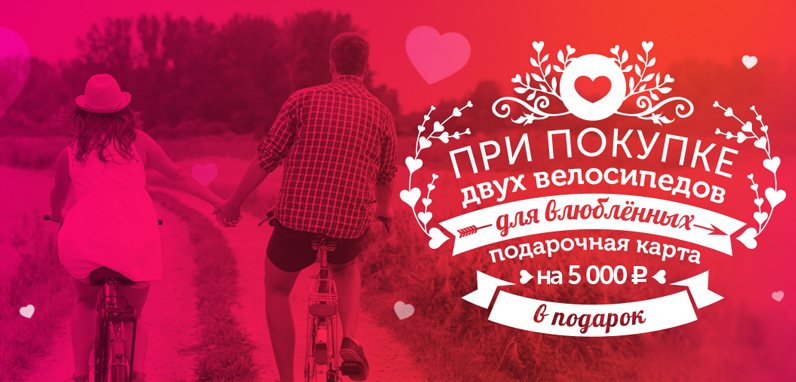 Мы рады предложить Вашему вниманию новую акцию «Велосипеды для влюблённых!» С 7 по 14 февраля при покупке двух велосипедов сразу – мужского и женского – Вы получаете подарочную карту «ВелоСтрана» на 5 000 руб. Подарочная карта даёт право выбрать любые товары в нашей сети на указанную сумму.