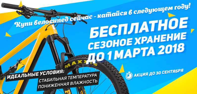 Дорогие друзья, лето закончилось, но Велосезон-2017 продолжается! Это значит, что впереди ещё яркие велосипедные путешествия, встречи с друзьями, наслаждение осенней природой! Для всего этого Вам необходим отличный велосипед. Покупая велосипед в магазинах «ВелоСтрана» на сумму от 30 000 руб, вы получаете в подарок услугу «Сезонное хранение велосипеда»! Катайтесь на велосипеде до 30 ноября, а по завершении сезона храните байк в идеальных условиях до 1 марта 2018 года!