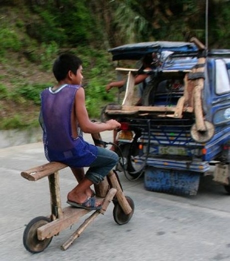 Жители Юго-Восточной Африки и Филиппинских островов очень любят мастерить деревянные байки. Бедному крестьянину, живущему в джунглях, такой примитивный, но крепкий вид транспорта очень кстати как для поездок на работу в поле, так и для транспортировки грузов (грузовые велосипеды при этом достигают размера автомобиля). Педали на подобную грубую конструкцию не ставятся, отчего механизм скорее напоминает самокат, чем велосипед. Но зато местные умельцы не забывают про покрышки и покрывают колёса толстым резиновым слоем. Особо «прокачанные» модели оборудуются даже оригинальными «ободными» тормозами, представляющими собой деревянную педаль с прибитым к ней бруском, который при нажатии трётся о заднее колесо.