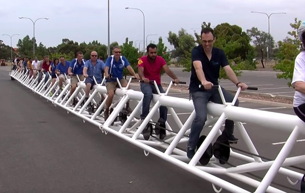 Итак, сегодня мы представляем Вашему вниманию, новый рекордный велосипед на 20 человек, чьё авторство принадлежит группе австралийских студентов-технологов. Примечательно, что конструкция велосипеда свободно выдерживает 1,5 тонны – и это при том, что на модели стоит только два колеса! Длина велосипеда (которую, само собой, скоро переплюнут другие изобретатели) составляет 41 метр!
