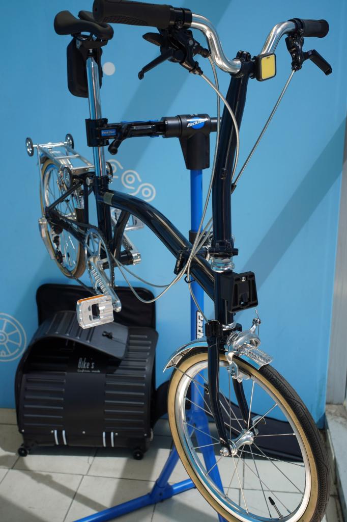Складывается буквально всё: педали, руль, рама, задний треугольник уходит под трубу. В таком виде он размером с небольшой чемонданчик.