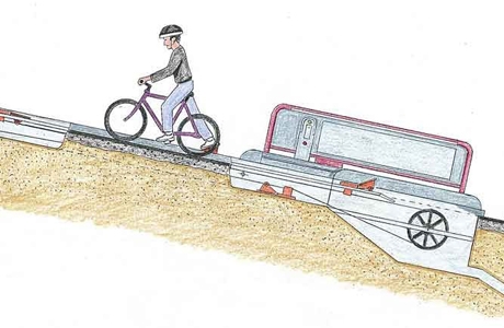 Вернее приходилось! Вплоть до 1993 года. Именно тогда предприимчивые норвежцы решили запустить в жизнь такой эксперимент, как велосипедный лифт. Установили его в историческом центре и проложили по самой оживленной улице, ведущей на вершину горы Брубаккен, где расположен университетский городок. Сам же лифт представляет собой довольно простую конструкцию – дорожка с тросом, к которому прикреплена педаль-ступенька с гидравлическим амортизатором внутри. Работу лифта обеспечивает двигатель мощностью 6 кВт, в совокупности лифтом могут воспользоваться одновременно до 6 велосипедистов.   Движение активируется с помощью специальной карты. Сидя на велосипеде, Вы опускаете ногу на эту педальку, которая выскакивает после оплаты проезда, механизм крепится к ноге и тянет свою добровольную жертву в гору. Через минуту без каких-либо особых усилий Вы уже на вершине!
