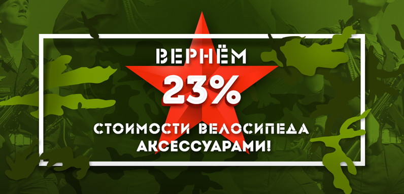 Велосипед – это отличный подарок для мужчины, ведь велосипед укрепляет организм, дарит восторг от путешествий и позволяет везде успевать. И мы, со своей стороны, объявляем о старте сногсшибательной акции «Вернём 23 % аксессуарами!» С 15 по 26 февраля при покупке велосипеда ВелоСтрана дарит любые велоаксессуары (насосы, крылья, фляги, велозамки, сумки и т.д.) на сумму, равную 23 % от стоимости купленного велосипеда! Купите велосипед и подберите необходимые комплектующие бесплатно.