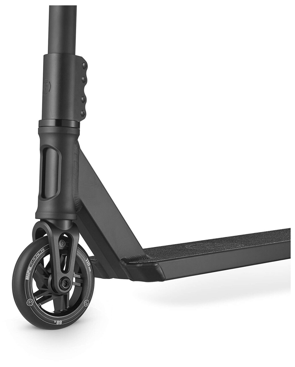 Также, дека имеет изгиб на верхней стороне для лучшего сцепления с обувью, вырез в рулевом стакане для снижения общего веса самоката, и полностью гладкий профиль с обратной стороны для лучшего скольжения по перилам и фигурам в скейт-парках. Руль на данной модели уменьшен в габаритах для большей стабильности самоката в воздухе, теперь его длина составляет 600 мм.