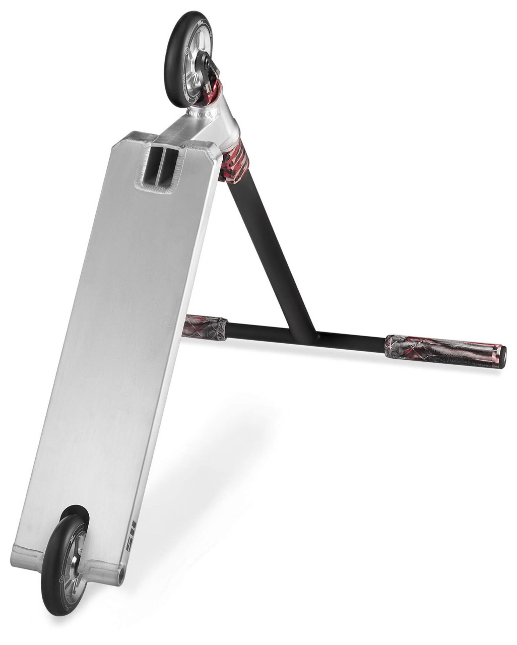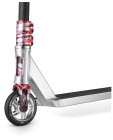 Также, дека имеет изгиб на верхней стороне для лучшего сцепления с обувью, вырез в рулевом стакане для снижения общего веса самоката, и полностью гладкий профиль с обратной стороны для лучшего скольжения по перилам и фигурам в скейт-парках. Руль на данной модели уменьшен в габаритах для большей стабильности самоката в воздухе, теперь его длина составляет 600 мм.