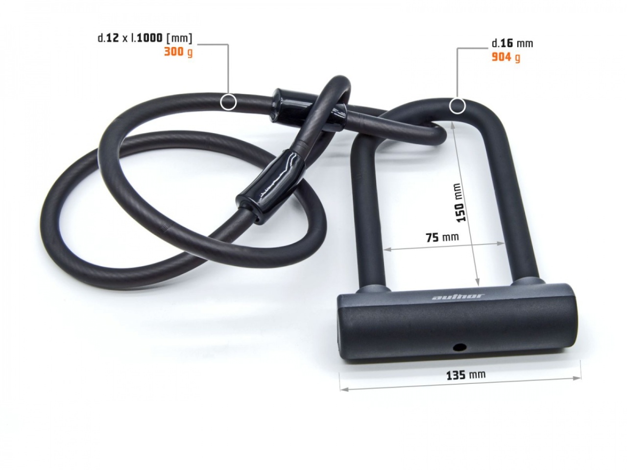 Author Cliff ART – велозамок, который совмещает в себе мобильность и легкость с одной стороны и надежность, прочность с другой. Замок покрыт защитной виниловой оболочкой, таким образом он защищен от попадания в него влаги, грязи и пыли. В комплект входят стальной трос, скоба для крепления замка на раму велосипеда, а также 4 ключа. Замок был протестирован независимой голландской лабораторией ART и получил прекрасные отзывы (сертификат 4239). Размеры скобы 205 x 135 мм, толщина - 16 мм. Стальной трос, который идет в комплекте с замком - толщина 12 мм, длина 1000 мм.
