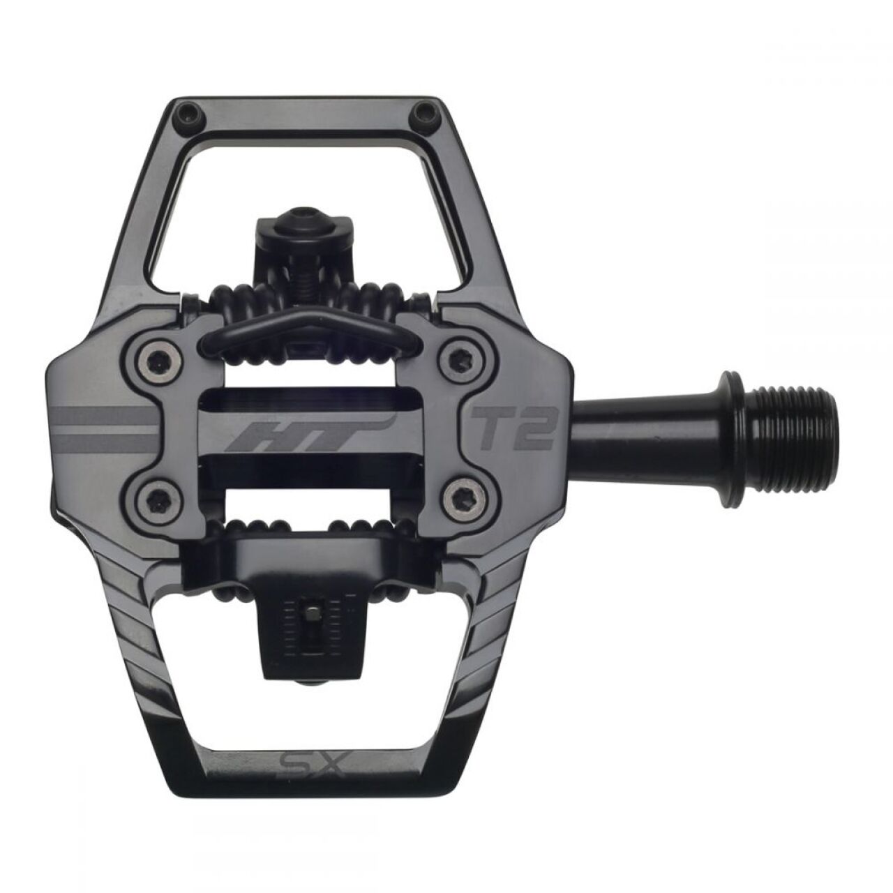 T2SX от именитого производителя профессиональных компонентов HT - пожалуй лучшее эффективное решение из контактных педалей для дисциплин трейл, эндуро и АМ. Платформа выполнена из легкого алюминиевого сплава, двусторонняя система зацепов из прочного Cr-Mo сплава. Рамка позволяет снизить нагрузку на стопу при жестких приземлениях и постоянном педалировании, а также осуществляет дополнительную защиту замка. Фиксируется корпус через герметичные промышленные подшипники и втулку скольжения igus, на стальную Cr-Mo ось, которые также в совокупности долго и беспроблемно служат в любых условиях. Система фиксации имеет регулировку усилия встегивания и выстегивания. Совместимы с фирменными шипами стандарта HT exclusive system - X1E / X1 / X1F. Обратите внимание, данные педали и система крепления несовместимы со стандартом SPD от Shimano.